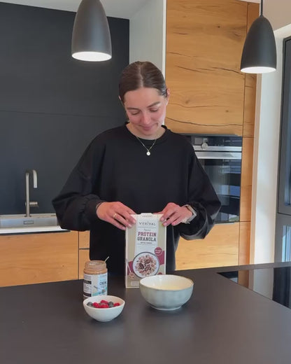 Are you looking for a granola with no added sugar? Then our protein granola with dates and almonds is the solution for you! The Verival protein granola is made without any industrial sugar and is only sweetened by dates and slightly sweet almonds. The flavour of wholegrain oat flakes is perfectly rounded off by a high-quality mix of crunchy sunflower seeds, almonds, pumpkin seeds and coconut flakes and the natural fruity sweetness of dates.